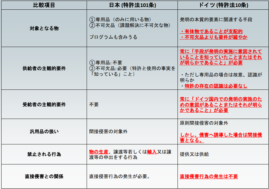 ドイツにおける間接侵害は、ドイツ特許法第10条によって規定されています。日本の特許法第101条に相当するこの条文は、直接の侵害行為が発生する前段階で特許権者を保護することを目的としています。以下にドイツにおける間接侵害の成立要件そして日本の制度との相違点を説明します。