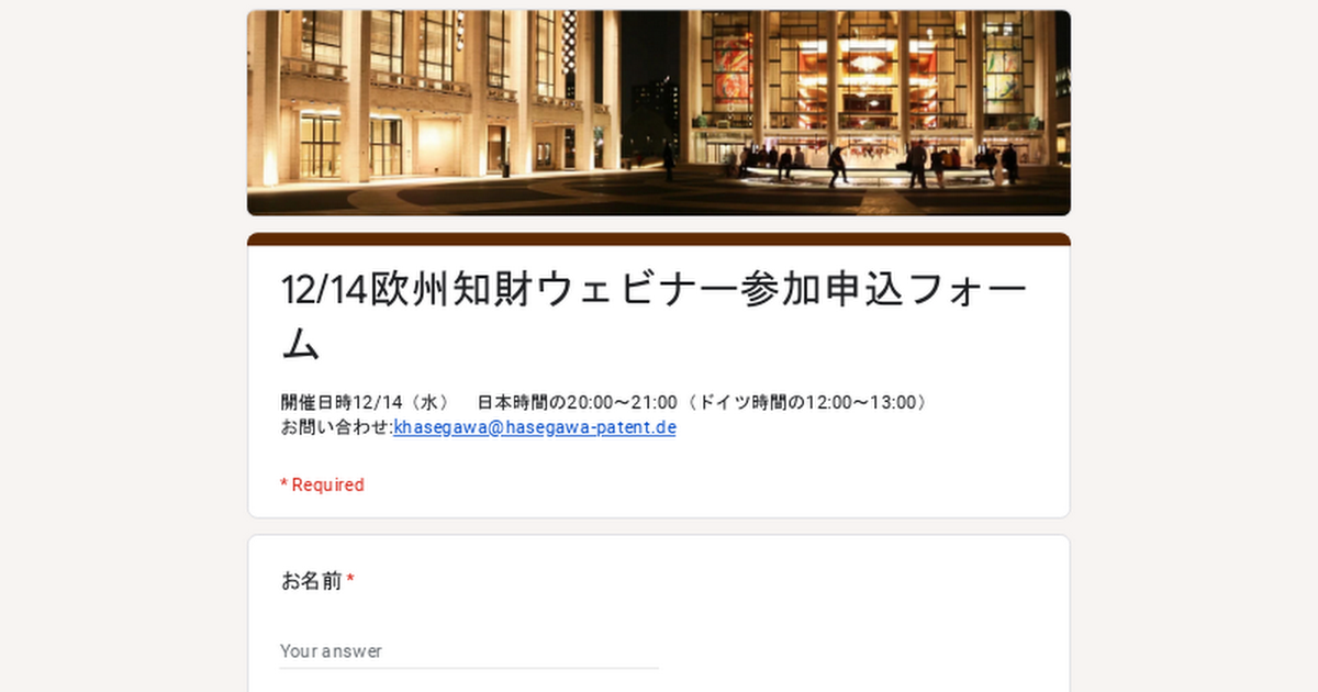 開催日時12/14(水) 日本時間の20:00~21:00(ドイツ時間の12:00~13:00)お問い合わせ:khasegawa@hasegawa-patent.de
