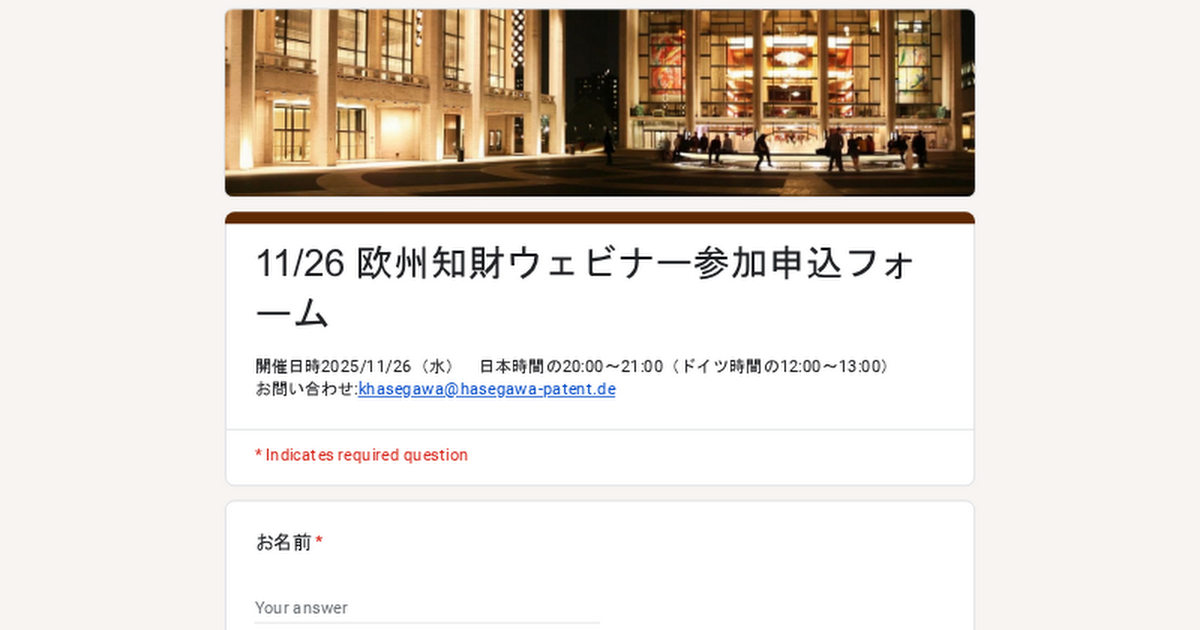 開催日時2025/11/26(水) 日本時間の20:00~21:00(ドイツ時間の12:00~13:00)お問い合わせ:khasegawa@hasegawa-patent.de