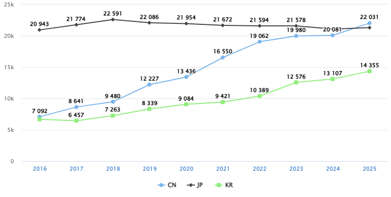 欧州特許出願数の推移 日中韓比較 2016-2025 2026.04.05 ソース: https://www.epo.org/en/about-us/statistics/statistics-centre#/customchart